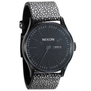 The Nixon Mens Sentry Leather Watch keeps a close eye on your time like a taught, sophisticated Roman honor guard. A smooth leather band wraps around your wrist with graceful authority while a stainless steel face stands post over your window of time. Nixon crafted clean lines into this large-sized watch, so you can trust its disciplined style to protect your precious time no matter where the call of duty takes you.Product Features